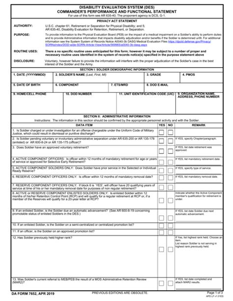 It is a form that assesses a soldier’s physical. Da form 7652 is used by the us army as part of its physical disability evaluation system (pdes). Get a da 7652 here.